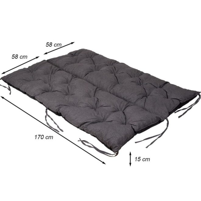 Poduszka ma długość 170 cm i składa się z dwóch zszytych ze sobą części o szerokości 58 cm. Dzięki temu idealnie pasuje na statyczne siedzisko huśtawki, jak również rozkładane. Poduszka jest pikowana na całej powierzchni, co czyni ją jeszcze wygodniejszą.